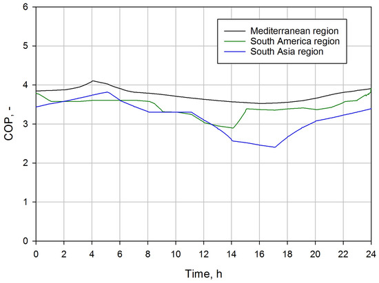 The characteristics of the ejector performance during the summer campaign in different hot climate zones are strongly related to the COP value of the system, especially during work in the daytime. Hence, Figure 12 presents the COP comparison for the R744 ejector-based system at different climate regions for 24 h during the summer campaign. The pressure ratio was set to 1.22 to achieve the highest ejector efficiency. The R744 refrigeration system equipped with the two-phase ejector obtained the highest COP values of above 3.5 in the Mediterranean region due to the subcritical operation for most of the investigated time according to Figure 8a. The lowest COP during the day was observed in the afternoon at approximately 4:00 p.m., whereas the highest peak of COP was reached at 4:00 a.m. The R744 ejector-based system experienced a lower COP in the South America region due to the higher daily ambient temperature, which is shown in Figure 8b. The significant COP drop below 3.0 was observed at approximately 2:00 p.m. The lowest COP of the R744 refrigeration system was obtained for the South Asia climate zone due to the very high ambient temperature above 40 C. Therefore, the COP dropped from approximately 3.8 to less than 2.5, although the energy performance of the R744 ejector-based system was higher between the second hour and sixth hour as a result of the ejector performance. The significant difference in COP between the selected climate regions forced the control process of the R744 refrigeration system to be improved to operate close to the optimum COP.