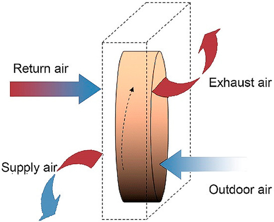 The rotary wheel heat recovery system is a motor-driven rotating porous wheel. When heat and moisture exchange happen, the two streams alternately pass through the wheel, as shown in Figure 2. The speed of rotors is usually low, ranging from 3 rpm to 15 rpm [7].