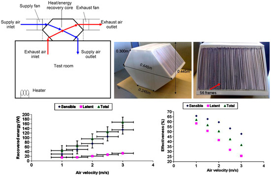 - Mardiana-Idayu, A.; Riffat, S.B. An experimental study on the performance of enthalpy recovery system for building applications. Energy Build. 2011, 43, 2533–2538. [Google Scholar] [CrossRef]