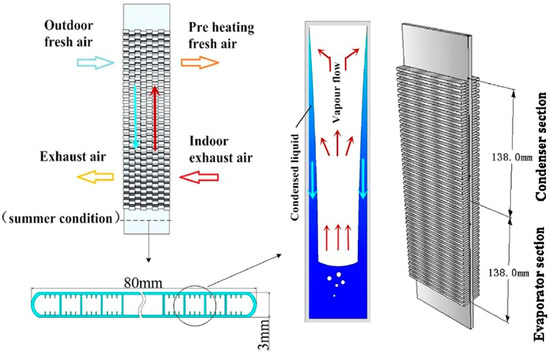 From Yau et al. it can also be found that using heat pipe recovery systems can lead to significant energy savings in domestic appliances within tropical climates [37,38]. Recently, Diao et al. provided a new study involving a small flat heat pipe heat recovery device which applies a flat micro-heat pipe array with welded, serrated, and staggered fins on its surface, as shown in Figure 8. The results showed that the maximum heat exchange rate and coefficient of performance (COP) could be 78% and 91.9, respectively, under experimental conditions [39]. This study of a small flat heat pipe heat recovery system indicates the potential for improving the thermal performance of heat pipe heat recovery. However, further real-life evaluation is still needed.