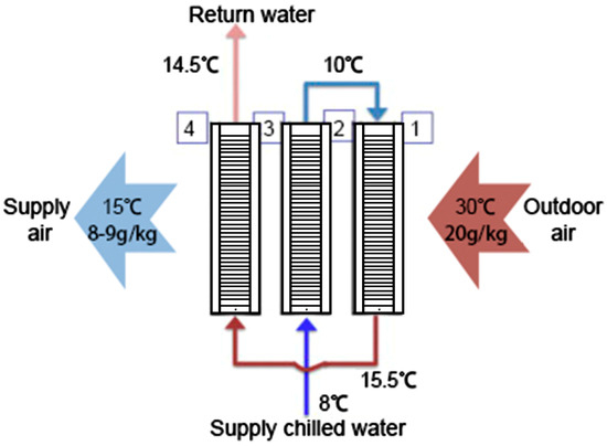 Compared with centralized ventilation, pressure loss can be minimized within decentralized ventilation, due to the shorter distance of the air routing [44]. Several researchers have tested the performance of heat recovery units with decentralized ventilation systems based on different outdoors conditions. Baldini et al. has conducted a decentralized cooling and dehumidification system, as shown in Figure 11. Multi-stage type heat recovery could help to reduce the temperature compared to a single heat exchanger. Experimental results showed that under an environment temperature of around 30 °C and a humidity ratio of 20 g/kg, the application of the multi-stage heat recovery could reach the preferred target, with the supply air at 14–15 °C and 8–9 g/kg. Additionally, because of the free reheating, the system is able to save about 4–5% of cooling energy demand [44].