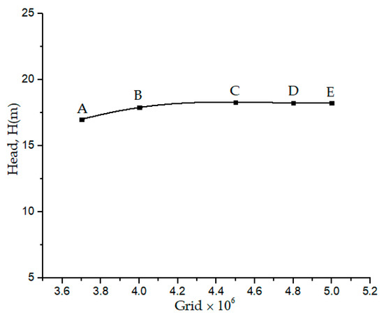 The ICEM CFD meshing tool is used to build three dimensional multi-block structured computational grids of the inlet, impeller, side channel and the outlet for all the three pump cases. The mesh independence and grid convergence analyses have been conducted by Pei et al. [24]. Pump case 2 is selected for the analysis of the effect of the mesh number on the head performance at the best efficiency point, QBEP. Figure 2 shows the mesh independence analysis carried out on pump case. The head is calculated using Equation (11). The mesh C which consist 4.5 million is selected for further numerical calculations after following the procedures outlined by Celik et al. [31]. For consistency with the mesh independence analysis, cases 1 and 3 are then gridded with the same blocking method with an approximated grid number of pump cases 1 and 3.