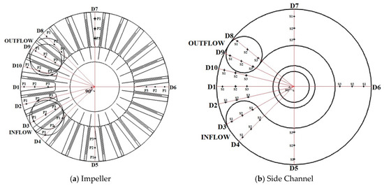 The pressure flow parameter is monitored in the impeller and side channel at different locations as indicated in Figure 4. “D” stands for diameter line in both impeller and side channel while P1, P2 and P3 represent the outer radius, central radius and inner radius of the blade respectively. Furthermore, S1, S2 and S3 represent the side channel flow-in from the impeller, side channel central radius and side channel flow-out to the impeller passage, respectively. A distance of 0.008 m is set between P1–P2, P2–P3, S1–S2 and S2–S3. The angle between D4–D8 is 90° with 15° between each two successive impeller blades. The angle between adjacent diameter lines D1-D5 was 90°. All the static pressure data in the impeller passage are recorded at z = 0.0025 m which is close to the impeller side channel interface whiles in the side channel passage, z is set at −0.007 m.
