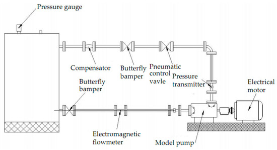 To delineate the unsteady flow fields in the pump, verification of the CFD or numerical results with respect to the experimental data is required. Pump case 2 is manufactured for the experimental test measurements to give global view of all the pump cases. For the purpose of numerical calculations, the lengths of inlet and outlet pipes are extended to about four times the pipe diameter. This is done to achieve a fairly stable flow and accurate results. Figure 5 shows a 2D sketch of the experimental test rig used. The experimental test rig is a closed loop system equipped with calibrated device for input power, flow rate, inlet pressure and discharge pressure measurements. The inlet and discharge pressures are obtained by pressure sensors of measuring range 0 to 10 bar with uncertainty of 0.15%. The volumetric flow rate of each operating condition is measured with electromagnetic flow meter (0.9–30 m3h−1) and its maximum measuring error is ±0.5%. The shaft power of the tested pump is driven by variable-speed electric AC motor and controlled by a frequency drive of 0 to 50 Hz. The readings (20 sample data) are taken at constant speed for each valve opening at different flow rates.