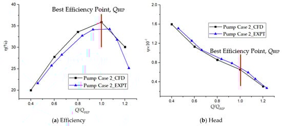 The CFD heads and efficiencies at all operating conditions are obtained by averaging the values during the last two impeller revolutions. As illustrated in Figure 6a, the efficiency and flow rate ratio Q/QBEP are potted on the y and x axes, respectively. The efficiency curve increases gradually and decreases after the best efficiency, QBEP. The QBEP marks the maximum efficiency and highlighted in red. The value of the QBEP is 10 m3h−1. The CFD efficiency is higher than the experimental measurements at all operating conditions. This is because mechanical losses were not taken into consideration during the numerical calculations. The QBEP of the CFD efficiency curve is 35.9% whereas that of the experimental efficiency is 34.2%. The largest deviation on the efficiency curves occurs at the QBEP and is about 4.90%. Figure 6b shows that higher head values are concurrent with lower flows. The rise in pressure is due to the high circulatory velocity the fluid attains at low flows [32]. Largely, the experimental heads are higher than the CFD heads. The best agreement between the curves occurred at part-load conditions from 0.4 QBEP to 0.8 QBEP. At the QBEP, the deviation between the experimental and CFD head coefficients is 5.27%. This shows that there is a good agreement between the CFD and experimental results thus the CFD results can be used for further analyses. However, the hydraulic performance comparison of the three pump cases has been conducted in details by Pei et al. [24].