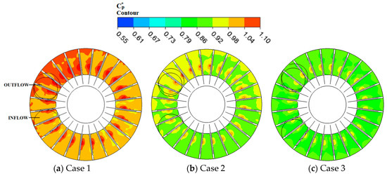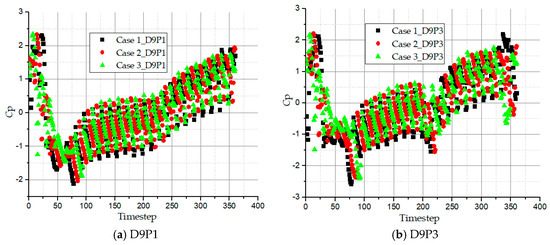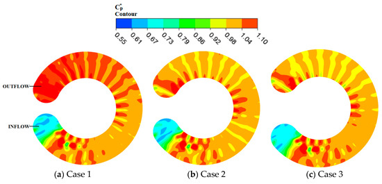 The outflow region is characterized with high static pressure at D9P1 (blade outer radius) and D9P3 (blade inner radius) because the flow has undergone about 22 impeller turns from the relative position, ϕ to develop a very strong pressure. In Figure 15, the pressure fluctuation coefficient of D9P1 and D9P3 present regular amplitudes except for the interrupter, inflow and outflow regions. As mentioned earlier, the pressure fluctuations of the monitoring points are affected by the flow exchange times which subsequently depend on the size of the wrapping angle. Case 1 reaches the highest pressure at D9P1 and D9P3 than the other two cases at the end of the complete circulatory cycle. Case 1 has the shortest interrupter length therefore the flow is exchanged many times than the other two pump cases.