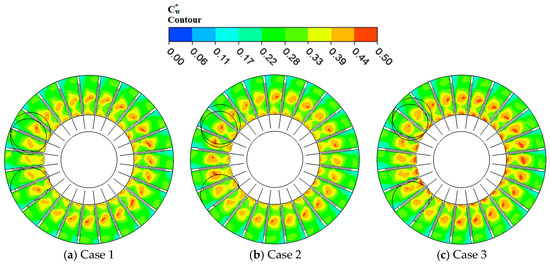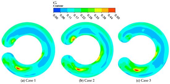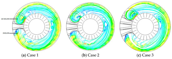 Largely, the side channel passage of all three pump cases marks higher pressure fluctuation intensity on plane 2 than the impeller passage in Figure 9. The inflow regions of the three cases presented very low pressure fluctuation intensity because of the small centrifugal force imparted unto the incoming flow by the impeller. Around the middle section of the side channel of angular position (172.5°–217.5°) where the flow is assumed to achieve its full flow features, high pressure fluctuation intensities are recognized at the side channel flow-out (S3) for all cases. Figure 10 gives a reason to why high pressure fluctuation, values are observed at S3 because the sudden change geometry of the side channel results in vortex flows developed around angular position (172.5°–217.5°). High of about 1.10 is recorded around the outflow region for case 1 compared to the two pump cases. This is an indication that, the outflow region of case 1 is characterized with weak velocity developing into strong vortices at the outflow compared to cases 2 and 3 as shown in Figure 9. On the other hand, case 2 comparatively reaches higher intensity of pressure fluctuation than case 3 at the outflow region. Generally, higher pressure fluctuation intensities are associated with the vortices generated along the same positions in Figure 8. Subsequently, smaller wrapping angle yields higher pressure fluctuation intensity within the whole pump flow passage.