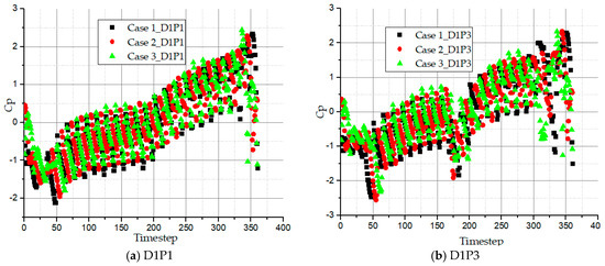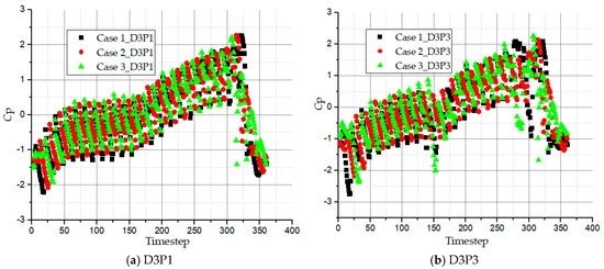 For the time-dependent history, the non-dimensional pressure coefficient is Cp is defined in Equation (17). This relation is to determine the periodic pressure with respect to time and the impeller rotation angle: