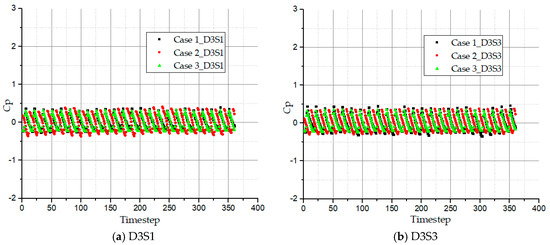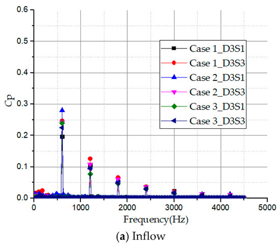 Overall, case 3 marks the weakest pressure fluctuation coefficient while cases 1 and 2 attain similar magnitudes at both D6S1 and D6S3 points. Again, monitoring points D6S1 and D6S3 show larger coefficient range of the pressure fluctuation values compared to D3S1 and D3S3. Thus, pressure fluctuation intensity in the side channel is mainly influenced by the interaction of the rotating impeller and side channel.