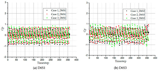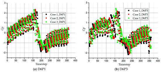The pressure fluctuation coefficient histories of inner radius, D6P1 and outer radius, D6P3 at 180° from the relative position, ϕ are as illustrated in Figure 13. At this angular position, the fluid is expected to develop its full flow characteristics and have sufficient fluid power after undergoing about twelve impeller turns, yet the inner radius D6P3 records greater coefficient of pressure fluctuation than D6P1. This happens because portions of the flow exit from the inner radius due to the sudden change in geometry at this angular position. For cases 1 and 2, the flow leaves the impeller with similar pressure coefficient at the D6P1 at the end of the circulatory cycle which are higher than case 3. This still indicates that the smaller the wrapping angle the stronger the flow exchange in the impeller becomes, therefore the pressure fluctuation intensity increases.