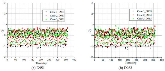 Figure 16 depicts the pressure fluctuation coefficients of monitoring points D9S1 and D9S3 in the side channel passage. The pressure fluctuations at these points also reveal 24 regular amplitudes in one complete oscillation which represents the blade number. Similarly, the side channel also records high pressures at the side channel in-flow, D9S1 and out-flow, D9S3. The reason is that, the flow leaves the blade outer radius (D6P1) with very high pressure energy compared to the other monitoring points. The pressure coefficient of the pressure of case 1 at both D9S1 and D9S3 are slightly higher than case 2 while that of case 2 is also higher than case 3. This shows that decreasing the wrapping angle produces high pressure fluctuation intensities.