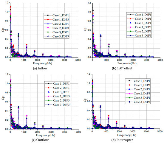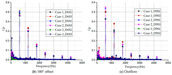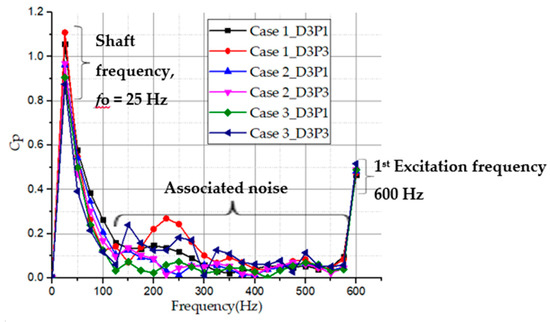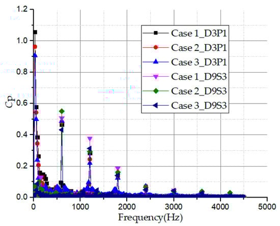 Figure 18 presents the history of the frequency domain spectra acquired by using the Fast Fourier Transformation (FFT) analysis of the monitoring points in the impeller passage. The pressure coefficient amplitudes show a decreasing trend with increasing frequency at all monitoring points in the impeller passage. The main pressure fluctuation amplitudes of the frequency domain history in each monitoring point are nearly the same and occurred at the low-frequency region. The pressure intensity amplitudes are mainly subjected to the shaft frequency, fn and the blade passing frequency (BPF). The shaft frequency occurred at 25 Hz while the blade passing frequencies occurred at multiples of the shaft frequency: