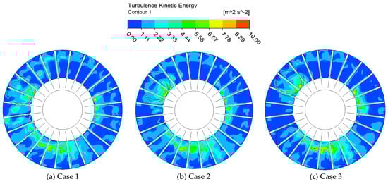 In the impeller flow passage, there was little flow exchange at the central radius which resulted in a large vortex; thus, the central radius depicted the highest relative velocity fluctuation intensity in the impeller passage for all pump cases, especially in case 1. The inner radius marked higher relative velocity fluctuation than the outer radius for all pump cases. This makes the central radius and inner radius of the blade key regions to be considered for further studied in order to enhance the vibration and noise performance in side channel pumps. Eventually, case 3 showed the highest relative velocity intensity compared to cases 1 and 2.