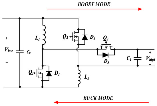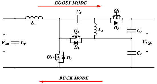 To overcome these problems, converters based on the integration of the boost converter with the Ćuk, Sepic, and buck-boost converters are presented in [23,24,25]. This attained a high voltage gain ratio and low voltage stress across the power switches. However, the converters operate only in unidirectional mode, and furthermore, the voltage and current stresses on the switches are not analyzed in detail. Therefore, a set of DC–DC converters operating in bi-direction with high voltage conversion ratio based on [23,24,25] are proposed in this paper.