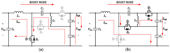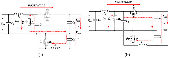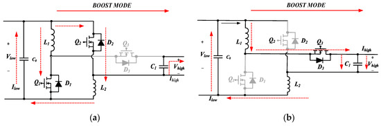 Q1 and Q2 are turned ON, Q3 is turned OFF, thus, d1 = d2 = 1 − d3 = dBoost. The switching states are depicted in Figure 10a,b.