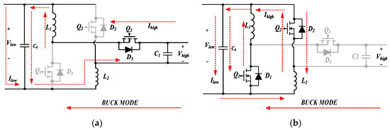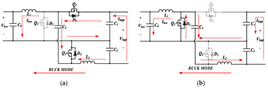 When the proposed converter I is applied to the buck mode, this is reverse to the boost mode, in which the gate signal of Q1 is complementary to Q2 and Q3; thus, d1 = 1 − d2 = 1 − d3 = dBuck. The topological stages are depicted in Figure 6a,b.