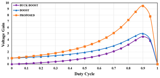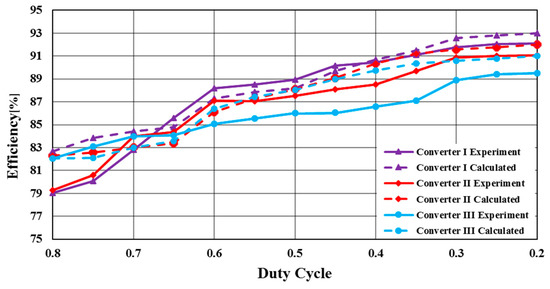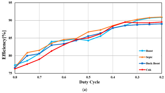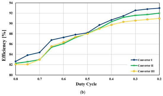 Based on the above analysis, the efficiency of conventional converters and proposed converters with different duty cycle is calculated and presented in Figure 13.