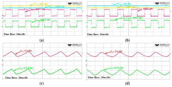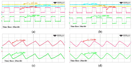 The voltage stress waveforms of Q2 and Q3, and Q1 in buck mode are presented in Figure 16b. It can be revealed that the voltage stresses on Q1–Q3 are approximately 150 V, which indicates that the voltage stresses on Q1–Q3 are equal to Vhigh/(1 + D). Under the same conditions, Figure 16d shown the inductors current under the buck mode.