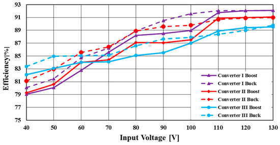 Efficiencies of proposed converters in boost and buck modes with Uhigh = 250 V, Ulow = 40–130 V, and Po = 200 W.