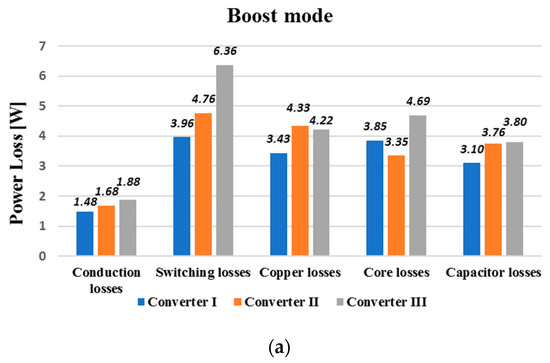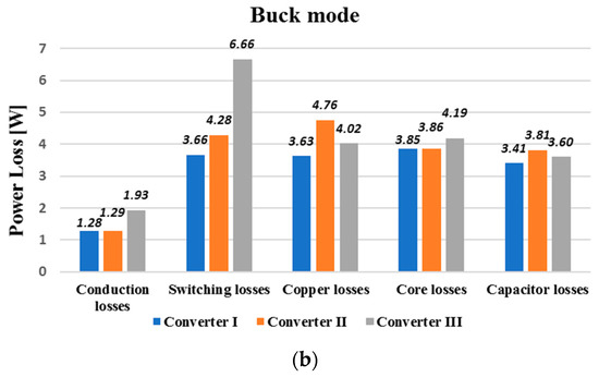 The power loss analysis are calculated under the experiment condition with Ulow = 120 V, Uhigh = 250 V, and Po = 200 W. When the suggested converters operate in boost mode, the comparison of loss analysis is presented in Figure 20a. According to analyzing results of the power losses distribution, the maximum power loss is calculated as 20.95 W, which is due to Converter III. It can be convinced that the dominant sources of power losses are due to the switching losses, which account for 25%, 26%, and 30% of the total losses, respectively. In case of the presented converters operate in buck mode, the loss distribution is presented in Figure 20b. By analyzing the distribution of power losses, the maximum power loss is found to be 20.4 W, which is due to Converter III. It can be maintained that the dominant sources of power losses are due to the switching losses.