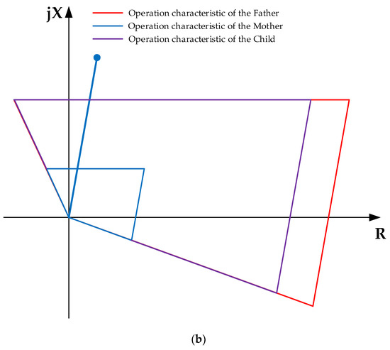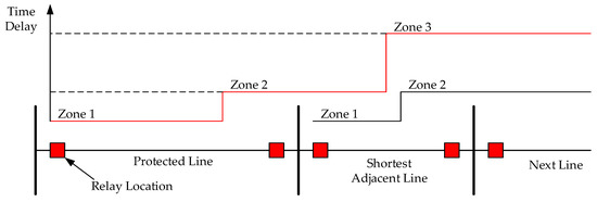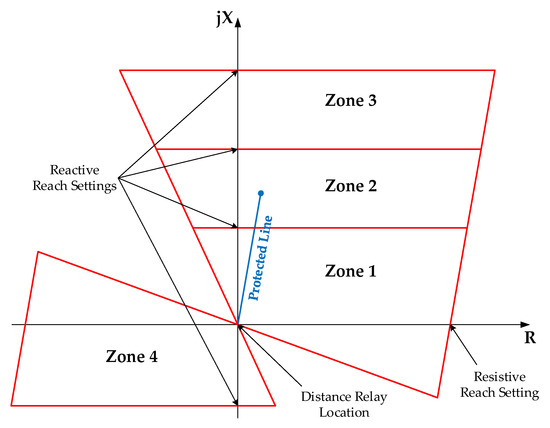 Zone 1 of the distance protection element shown in Figure 1 is usually called “underreach zone”, since it is usually set to operate with no time delay when a measured impedance loop is inside this zone. Due to the combination of measurement errors from the current and voltage transformers [14,15,16], the measured impedance loops can have a tolerance as high as ±15% of the actual impedance from the relay location to the line section where a fault occurs. As a result, Zone 1 reactive reach setting is usually set below 85% of the positive sequence impedance of the protected line [1], so that faults in adjacent elements (transformers, compensation devices or other lines) near the remote end of the protected line can be tripped by the protection elements of such elements, thus ensuring a certain degree of selectivity.