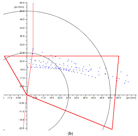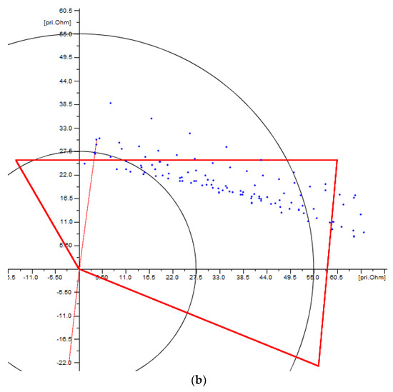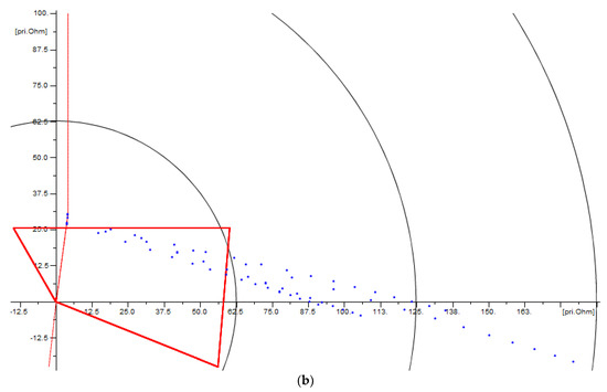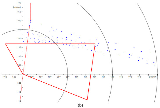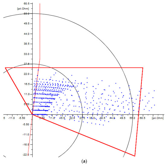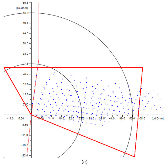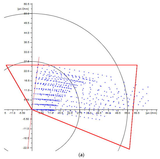 The optimization problem will be oriented to obtain a trade-off between the property of being selective and the property of being sensitive, for every zone, based on representative fault locations, organized in a hierarchical fashion for every zone, and entirely based on the results from a detailed short-circuit sensitivity analysis. For example, Figure 4a shows the operating characteristic of Zone 1, defined using the setting criteria previously described, and faults expected to be covered by Zone 1, this is, faults simulated at a maximum of 85% of the protected line length, given the performance criteria previously described for this zone; therefore, all those faults outside Zone 1 represent a loss of sensitivity.