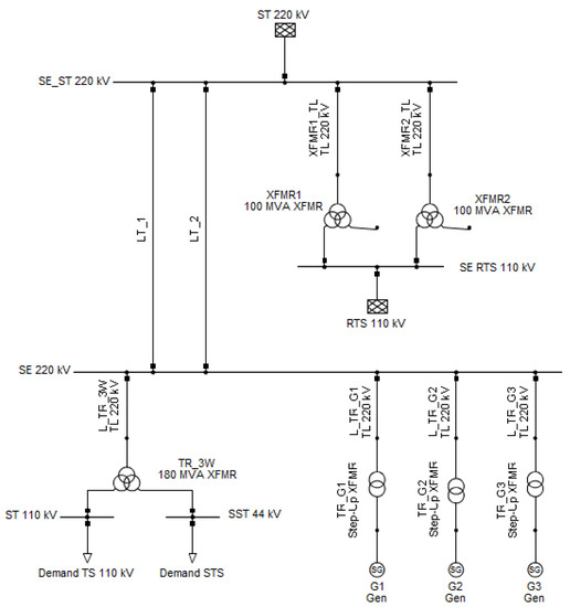 The sample transmission system, presented in Figure 6, was built from an existing network model, reduced to the portion of a network which will give the required topology to test the proposed solution strategy of the formulated minimization problem. The parameters of all the elements used in the sample system are presented in Appendix B, from Table A2, Table A3, Table A4, Table A5, Table A6 and Table A7.