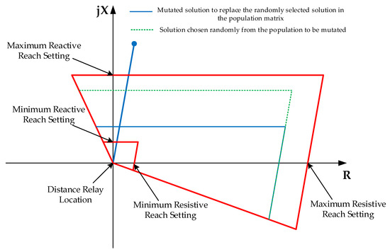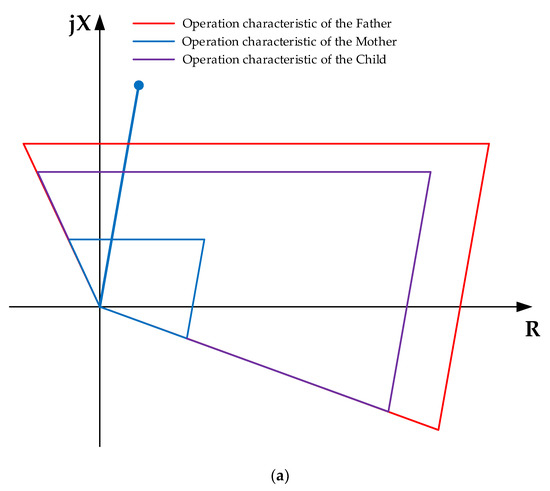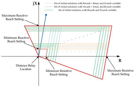 Given the two main factors affecting the performance of the operation characteristic of the distance protection element, selectivity and sensitivity, which correspond to the operative state of the line and the infeed effect [1,6], which may require the reduction of the zone reaches in X or in R, or in both, and that due to the size of the selected interval, which represents 25 steps, the population size is set to 75, in such a way that 25 solutions are considered in the initial population, with X1 in the maximum possible value and R1 variable, 25 with R1 in the maximum possible value and X1 variable, and 25 with R1 and X1 variating proportionally to their respective setting intervals, according to the combined error of the instrument transformers. A graphical summary of the method for stablishing the initial population is presented in Figure 8.