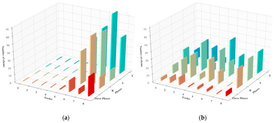 Distribution networks have their end users spread, distributed in any form, independently if regarding a LV feeder and its phases, or among different feeders connected to the same power transformer in a secondary substation [4,34,35]. Moreover, each end user, whether consumer, prosumer, or generator, has its own arbitrary pattern, even more diverse with the proliferation of DER technologies.