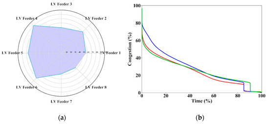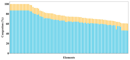 Regarding maximum congestion, 16 distribution network elements have measured values over 95% of their maximum admissible power [18], and 14 out of them reached their nominal maximum congestion of 100%. Regarding the conventional congestion threshold of 75% [19], 40 elements experienced congestion over that limit, and only 10 out of them remain over it at 1% of time scenarios. At the same time, 29 elements present a maximum congestion value measured below 35%, representing almost the fifth part of the group, and 17 out of them remained below 10%.