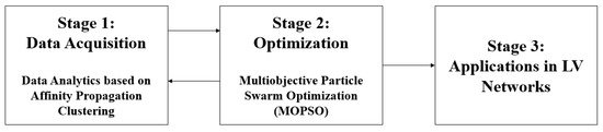 The methodology proposed here is especially designed for LV networks and seeks a compromise between the subjective human-based criteria and the precise but limited, as explained before, classical models. A data analysis is proposed here to address this challenge by means of clustering a significant group of distribution network elements. The aim is to provide insight into underlying patterns of data, to accelerate knowledge discovery, elements’ classification, and subsequent computational efforts [25,26]. In addition to this, an optimization problem is formulated in order to help make decisions for preventing and managing congestion in heterogeneous massive sets of distribution network elements [27]. This provides DSOs with enriched objective criteria for the proactive preventive operation and maintenance of their assets, unlike the mentioned precedents based on their subjective, conservative, and generalized experience. In particular, particle swarm optimization (PSO) is proposed here thanks to its applicability to solve multi-objective optimization problems, and to its capability to avoid finding solutions biased by predetermined human initial decisions [28].