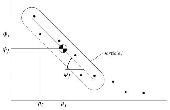 Therefore, in each iteration, every and corresponding to the center of each particle, in addition to , and the inclination angle of the linear regression of their points, will be evaluated in the following subfunctions of the multi-objective function, leading to a solution: