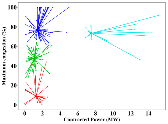 The lowest values obtained at the maximum congestion characteristic can be found in the members of cluster 4. Although all the power transformers of the group belong to cluster 3, which has the least number of members, clusters 1, 2, and 4 are highly heterogeneous since they have LV feeder phases belonging to every secondary substation of the group. In addition to this, three out of the four cluster centers belong to the same secondary substation, which evidences the diversity among elements that can be found even in the same asset of the distribution network.