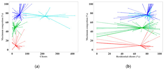 (a) Maximum congestion in relation to the number of clients and (b) in relation to the proportion of residential clients in the case study.