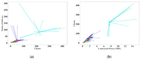 (a) Number of clients in relation to the number of points of delivery and (b) in relation to the contracted power in the case study.