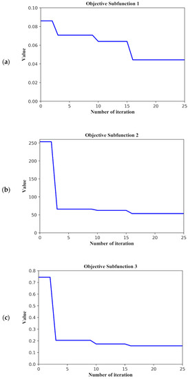 A representation of the evolution in the values obtained in the three objective subfunctions is displayed in Figure 11. Particularly, those are the values obtained by the best particle in each iteration of the algorithm in the Case 1, which is formed by a swarm of 15 particles with 3 points each, applied to cluster center 1. It must be noted that the role of the best particle can be played by different particles of the swarm along the different iterations, according to Pareto compliance.