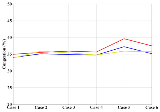 The example displayed in Figure 11 shows how values obtained for objective subfunctions 1, 2, and 3 are decreasing progressively, but not continuously, towards the minimum, leading to identifying a particle with the corresponding optimal congestion characteristic value of 68.00% displayed in Table 6. The global optimum finally results after 25 iterations, meaning that the stopping criterion of 10 consecutive iterations without any progress in the Pareto front has been applied; hence, the other stopping criterion of a maximum number of iterations of 100 has not been reached.