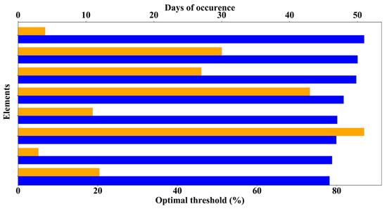 Optimal congestion threshold (in blue) and days of occurrence (in orange) in a set of elements in the case study.