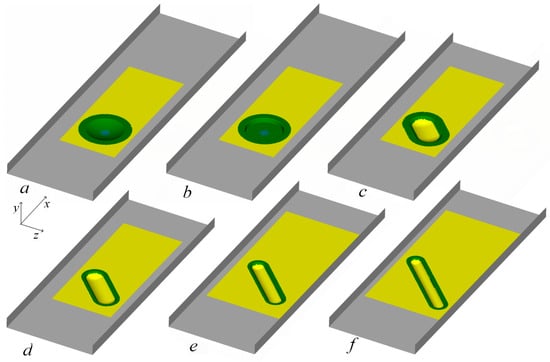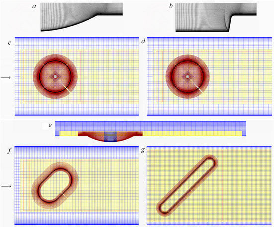 The area around spherical and conical grids is divided by a cylindrical grid adjusted to the dimple surface (Figure 2a,b); an additional grid close to a rectangular one (‘patch’) is introduced to prevent nodes from condensing in the near-axis zone. The minimum grid step near the edge is 0.002. In the case of oval dimples, a special edge grid is introduced to describe high-gradient zones. The total number of multiblock grid cells is about 1.5–3 mln cells.