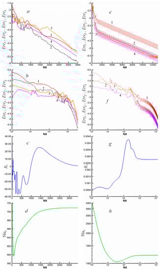 Convergence trajectories at linear (a,e) and logarithmic (b,f) scales, the dependences of the transverse load Rz (c,g) and the Nusselt number Nus (d,h) in the dimple region. Numbered curves: 1—Erru; 2—Errp; 3—ErrT; 4—Errk.