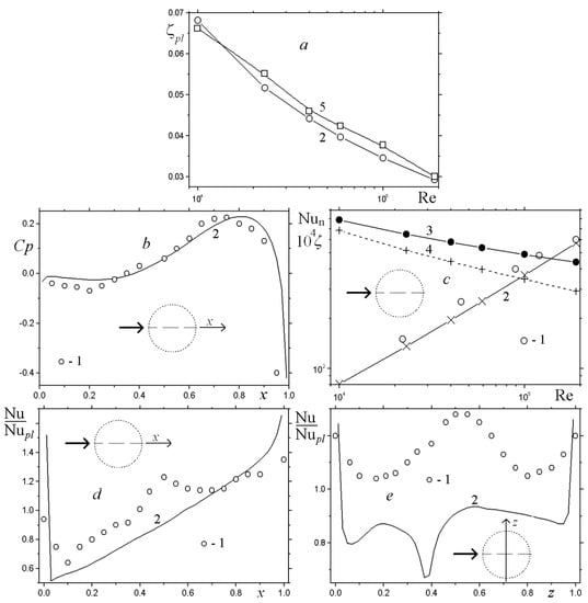 Verification: the comparison of the experimental data [] with the numerical predictions of flow and heat transfer characteristics in the narrow channel with a spherical dimple (dimple spot heating at q = const): 1, 3—experiment []; 2, 4—calculation; 3, 4—hydraulic losses; 5—data []. (a) ζpl(Re); (b) Cp(x); (c) Nun(Re), 104ζ(Re); (d) Nu/Nupl(x); (e) Nu/Nupl(z)