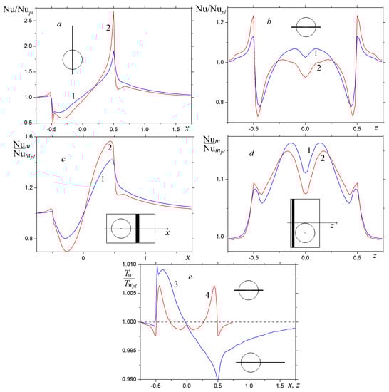 Calculated distributions of relative Nusselt numbers: local (a,b) and integrated over transverse (c) and longitudinal (d) strips of the selected section, as well as of relative wall temperature (e) in longitudinal (a,c,3) and transverse (b,d,4) middle sections of the dimple at different boundary conditions q = const (curves 1,3,4) and T = const (curves 2) at the heated wall of the narrow channel as in V.I. Terekhov’s setup.
