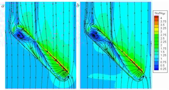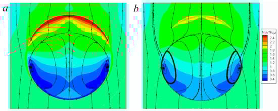 Calculated relative Nusselt number fields near the spherical dimple at the heated wall of the narrow channel at different boundary conditions and the streamlines: (a)—T = const; (b)—q = const.