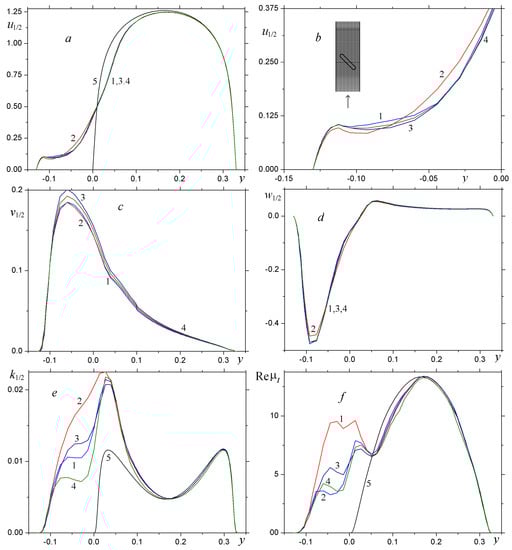 Distributions of longitudinal (a,b), vertical (c), transverse, (d) components of local flow velocity, turbulence energy (e) and normalized vortex viscosity (f) in the center of the oval dimple of width 0.383 obtained by the modified SST model: 1—SST model []; 2—SST model []; 3—SST model [] with RLI correction; 4—SST model [] with SM correction; 5—plane-parallel channel. b—longitudinal velocity component distribution (enlarged fragment).
