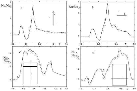 Distributions of relative local Nusselt numbers (a,b) and Nusselt numbers averaged over transverse (c) and longitudinal (d) strips of the rectangular section with the oval dimple (c,d) in longitudinal (a,c) and lateral (b,d) directions calculated on different grids: 1—initial variant (about 1.6 mln cells); 2—refinement (about 3 mln cells).
