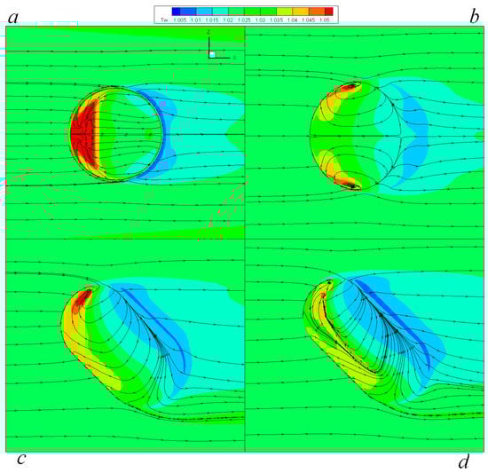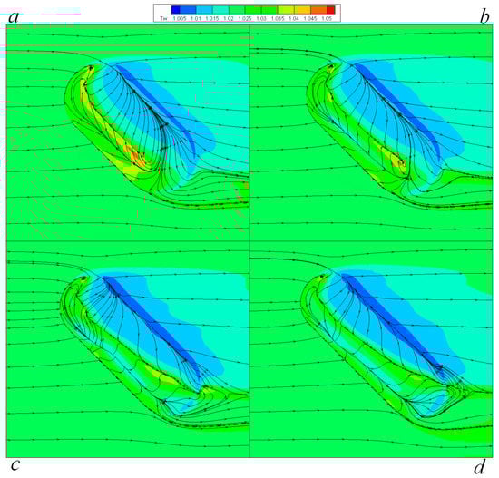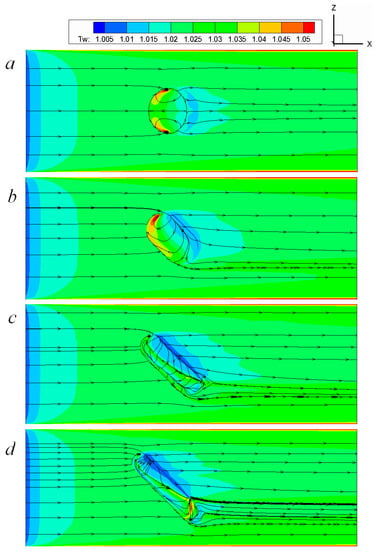 Figure 11 illustrates the temperature field variations at the heated wall of the narrow channel and the streamlines. First of all, it is of interest to note that in solving the thermal problem, where a fully developed isothermal flow at the channel inlet was assigned, heat transfer had time to stabilize in the vicinity of the dimple. As the dimple width decreased, the regions with a temperature close to characteristic and equal to 293 К increased. It can be seen that the flow structure near the dimple changes and the temperature field transformed. Very long decreased temperature regions appeared behind the dimple in comparison to the temperature regions at the plane wall of the narrow plane-parallel channel.