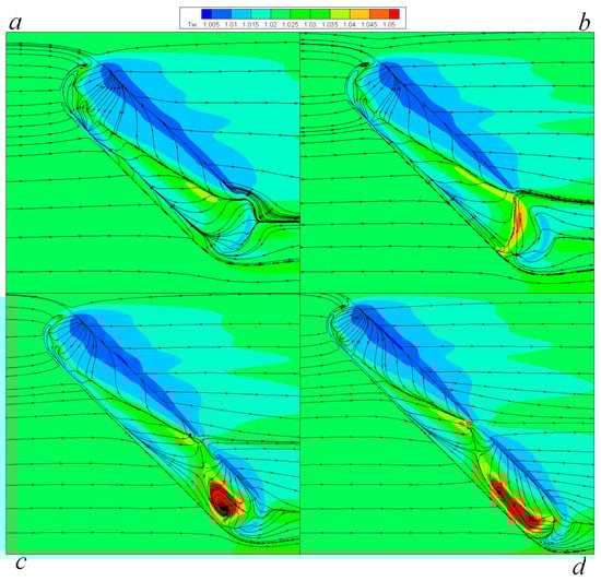 Temperature fields at the heated wall with oval dimples of width 1 (a), 0.731 (b), 0.549 (c), 0.429 (d) and the streamlines.