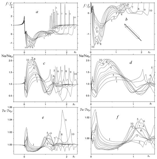 Comparison of the dependences of relative friction (a,b), Nusselt number (c,d), wall temperature (e,f) in the middle longitudinal cross sections for single oval dimples of different insert length: 1—L = 0.5; 2—0.625; 3—0.75; 4—0.825; 5—0.9; 6—1; 7—1.25; 8—1.5; 9—1.75; 10—2. b, d, f—enlarged fragments of the dependences.