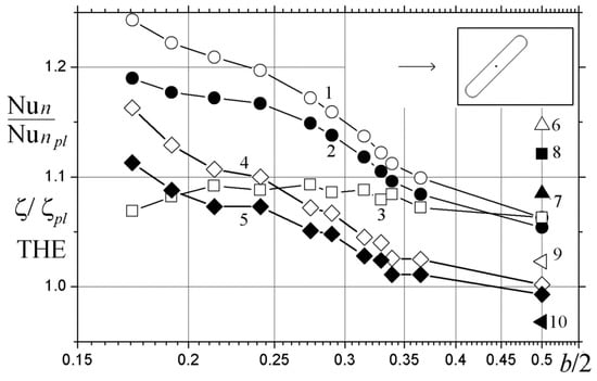 Influence of the oval dimple width b on thermal (1,2,6,7) and thermal-hydraulic (4,5,9,10) performances, as well as relative hydraulic losses (3,8); 6,7,8,9,10—conical dimple; 2,5,7,10—with regard to the area of the dimple inner surface in the 3 × 2 section and the shift of the dimple center by 1 from the front boundary.