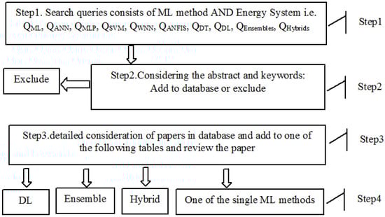 Figure 1 demonstrates the methodology of this review. In step 1 of the methodology the initial database of the relevant articles is identified based on the search queries of: “energy system” and “machine learning” or “neural network” or “support vector” or “ANFIS” or “WNN” or “DT” or “MLP” or “ELM” or “ensemble” or “deep learning.” However, for every ML method, we applied a new search query to suit that search well. These queries will identify the relevant articles, yet the queries are uncertain whether the ML model belongs to either ensemble or hybrids. Also, some articles in the initial database might not be relevant at all. For instance, a hybrid or ensemble model of ML may include single model(s). For that reason, steps 2 and 3 of the methodology are designed in such a way to classify the ML models into the right categories for the review. In step 4 the models are classified into the four categories and arranged in separate tables to be reviewed individually.